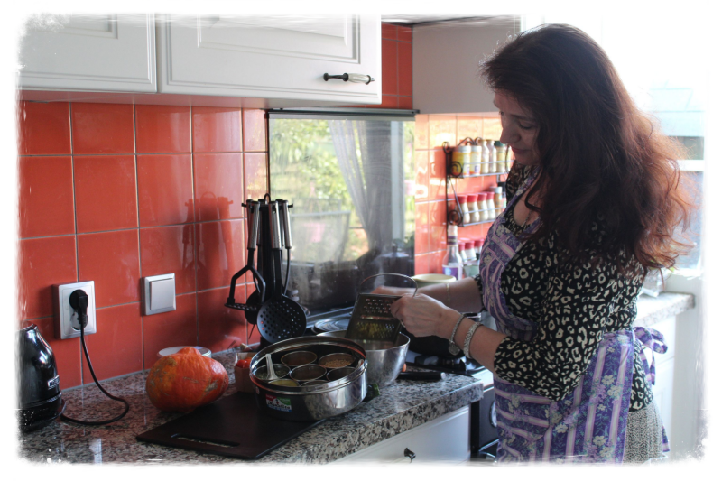 Ik ben vaak bezig in mijn kleine keukentje met het bereiden van Vedische maaltijden en lekkernijen. Het liefst eet ik tussen de middag mijn grootste (warme) maaltijd, het lukt helaas niet altijd, omdat ik les geef in Bilthoven en Utrecht op woensdag en donderdag. Maar regelmatig neem ik het één en ander mee in een speciaal bakje (wat lang warm blijft).